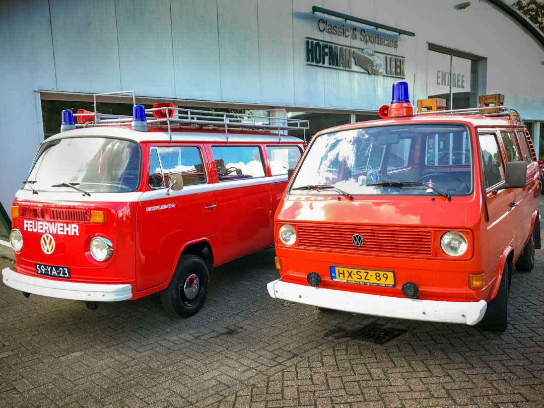 In Leek reed ik op weg naar de plek waar ik moest zijn langs een van de grootste oldtimerhandelaren van het noorden, Hofman Classic & Sportscars. Voor de deur stond een deel van het aanbod uitgestald, met als opvallendste wagen een T2b in vol brandweerornaat, inclusief twee zwaailampen en twee luidsprekers.