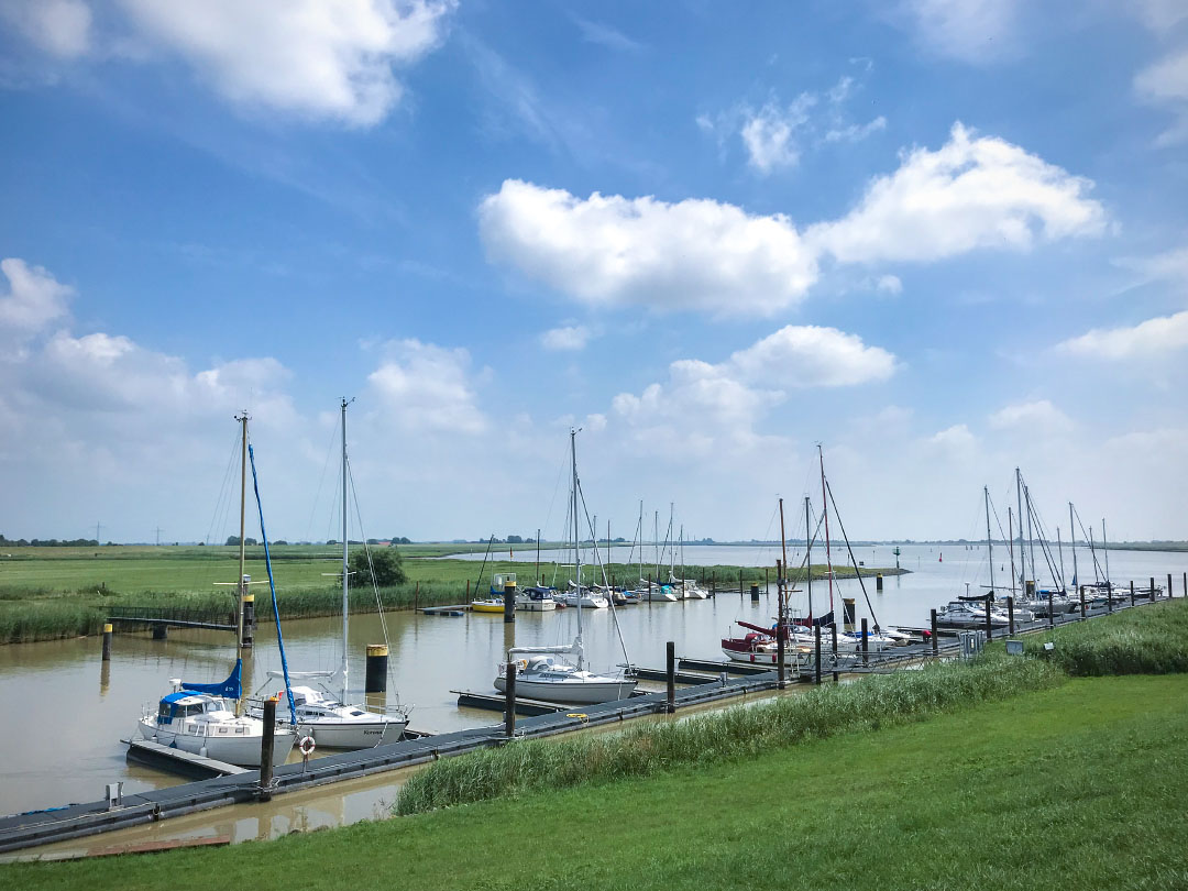 Een paar dagen naar de Duitse Waddenkust. Via de grote weg naar Leer, om daar onder de Ems door te gaan. Direct daarna via kleine wegen noordwaarts, met een tussenstop in Oldersum, alwaar een fraai uitzicht over diezelfde Eems.
