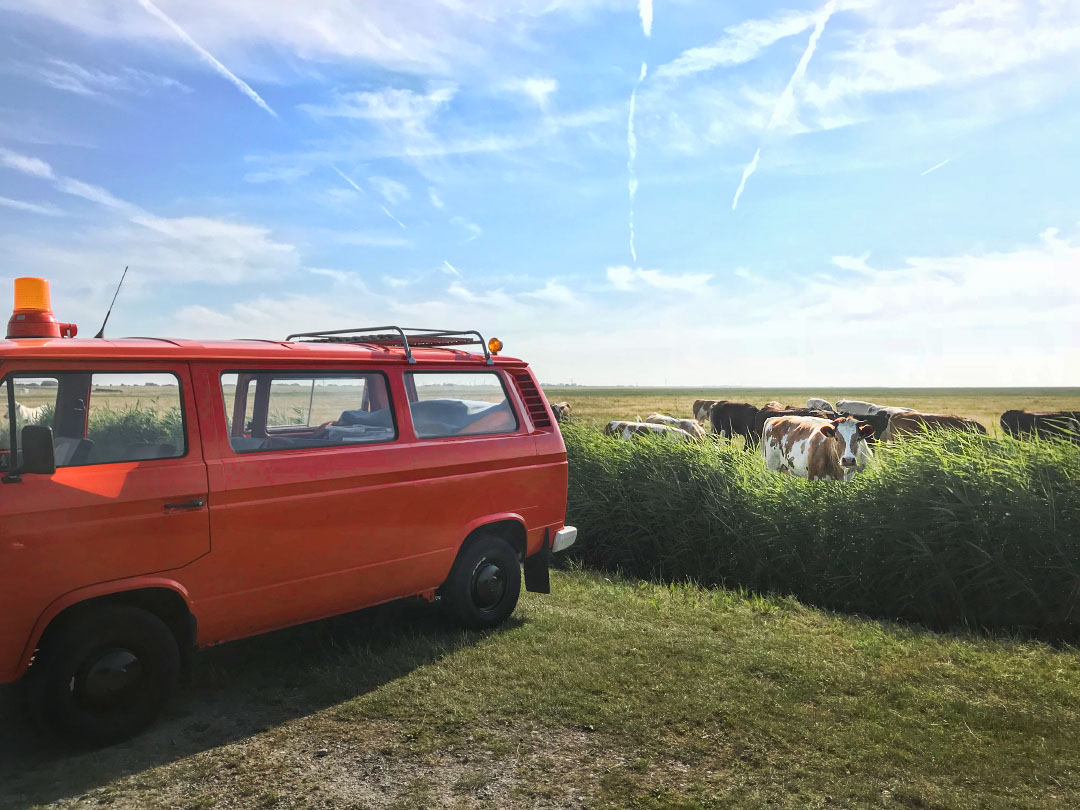 Op de kwelder grazen de koeien, die af en toe nieuwsgierig komen kijken naar de geparkeerde kampeerbussen.
