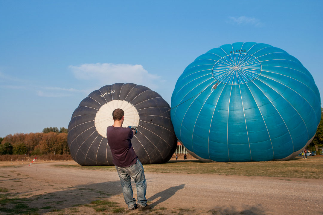 Op het grote grasveld naast de camperplaats (of eigenlijk maakt het veld er deel van uit) worden vlak nadat ik ben aangekomen twee luchtballonnen opgelaten. Met interesse volg ik de handelingen die bij het doen opstijgen van de luchtschepen komen kijken, en maak een reeks foto’s.