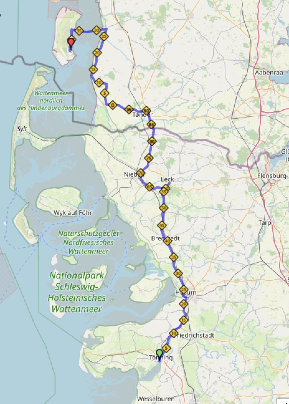 Daarna brak ik op voor de reis richting Rømø. Hoewel ik van tevoren had bedacht dat ik de B5 moest blijven volgen, liet ik me verleiden door Husum te rijden. Dat ging weliswaar redelijk snel, maar om het stadje heen rijden zou sneller zijn geweest. Even later stuurde de Garmin me weer van de B5 af, richting Leck. Daar aangekomen bleek er een wegafsluiting, en kon ik een heel end terug, tot ik een shortcut zag, dat ook nog eens een aardig weggetje bleek.