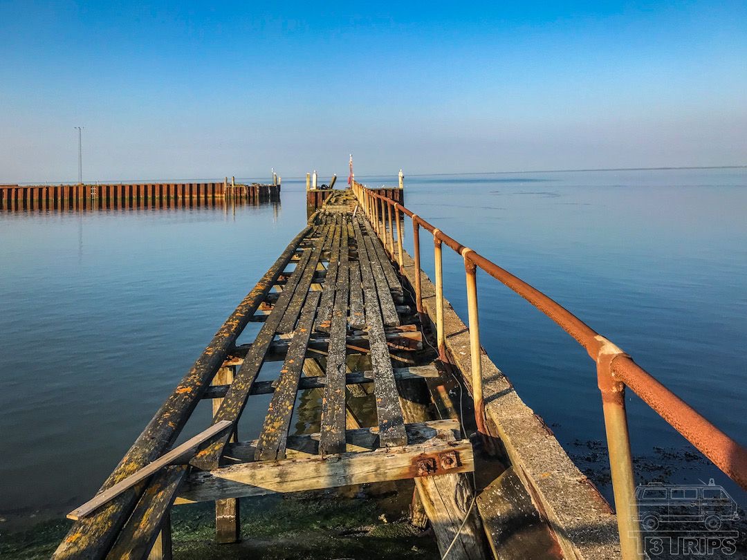 En dan… is daar eindelijk de dam. De dam die van Rømø een schiereiland maakt. Veel kwelder aan weerszijden om te beginnen. Daarna wordt de dijk omgeven door wat water. Halverwege stop ik op een kleine parkeerplaats. Spectaculair is het allemaal niet. Een beetje alsof je door Zeeland rijdt, en dan nog niet eens over de Deltawerken.