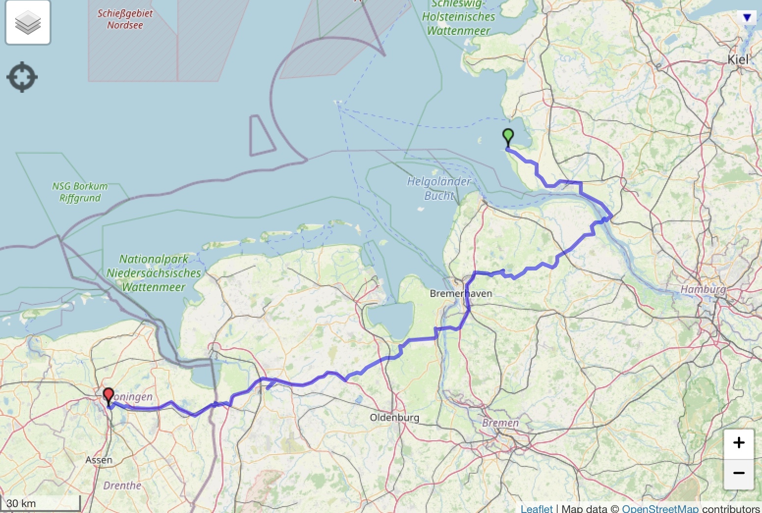 Via de B495, L116/119/120, A27, B437, L862/820/815 en A28 reed ik naar Bunde, om te tanken. Door Nieuweschans tufte ik naar de vaderlandse A7, en zo naar huis.