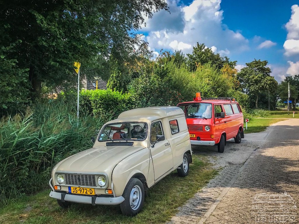 Een kort rondje in de buurt, om de bus weer even te laten rijden. Dat was de bedoeling. Binnendoor naar Zuidlaren en vandaar verder via Eexterzandvoort (jawel, dat bestaat) en Eext. Onderweg parkeerde ik de bus even achter een andere klassieker, een Renault 4 uit 1983.