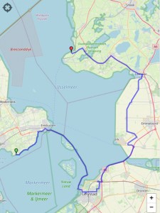 Waar ik gisteren de voormalige Zuiderzee overstak via de Afsluitdijk voert mijn route me vandaag over de dijk Enkhuizen – Lelystad, officieel Houtribdijk geheten. Ooit aangelegd voor de inpoldering van de Markerwaard, welk onzalig plan ten lange leste is afgeblazen, waardoor er nu een tamelijk nutteloze dijk ligt, afgezien van zijn functie als autoweg.
