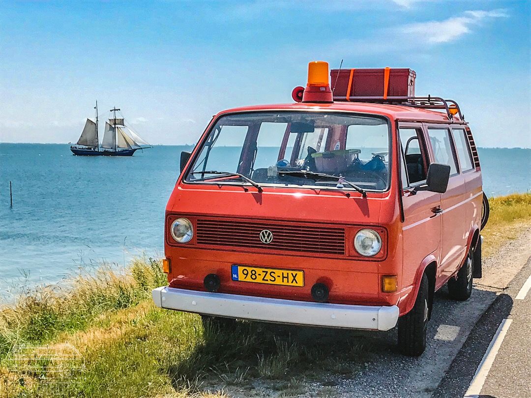 Na het ochtendtoilet en het inpakken van de bus vertrok ik van het campingterrein om via de dijk richting Enkhuizen te rijden. Vrijwel direct zie ik op het IJsselmeer een tweemaster die op koers ligt om relatief dicht langs de dijk te zeilen op het punt waar ik ben. Ik zet de bus aan de kant – dat kan op de smalle dijk net in een bocht waar het wat breder is – en wacht tot het vaartuig zich op de beste plek voor een staatsieportret met mijn bus bevindt.