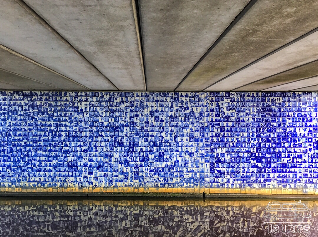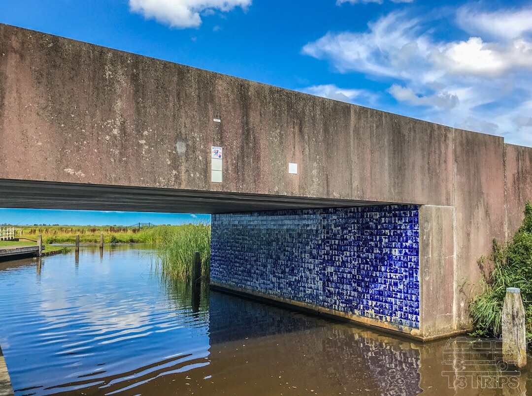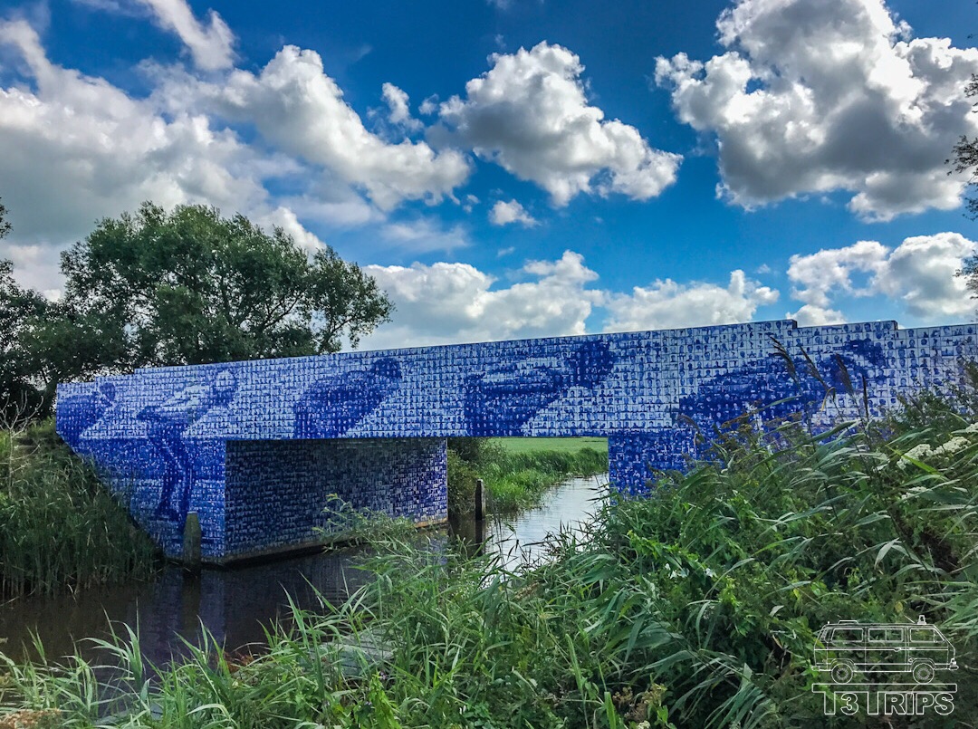 Kunstenaars Maree Blok en Bas Lugthart hebben op de brug het Elfstedenmonument ‘It sil heve’ aangebracht, een mozaïek van duizenden blauw geglazuurde tegeltjes met foto’s van (bekende en onbekende) deelnemers aan de tocht. Ik maakte er een korte tussenstop, bekeek de brug en het tegelmozaïek van alle kanten – via een steiger kan je onder de brug door lopen en daar de tegeltjes van nabij bekijken – en zocht even naar bekenden, maar dat was – gezien het grote aantal tegeltjes – onbegonnen werk.