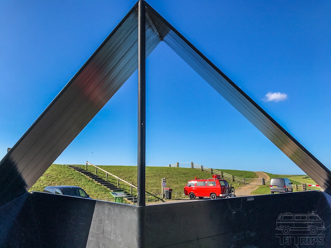 Ik reed naar de beoogde camperplaats in Westhoek, Hemisfeer – Nachttuin Westhoek geheten. Ik draaide niet direct de inrit naar de camperplaats op, maar passeerde het terrein over een verhoogde weg richting de Waddendijk, zodat ik vanaf een wat hoger standpunt het beste nog beschikbare plekje kon uitkiezen. Toen ik daar toch was, tufte ik nog even verder naar de Waddendijk, die ik (te voet, niet met de bus) beklom om over de kwelders uit te kijken. In de verte lag Terschelling. Boven de kwelder, maar ook binnendijks zag ik veel torenvalken en een enkele bruine kiekendief. Op de dijk nam ik van vrij dichtbij een zwarte roodstaart waar. Door een kunstwerk op de parkeerplaats heen, De Súdwester van Henk Rusman, fotografeerde ik de bus (en nog een ander daar geparkeerd busje).