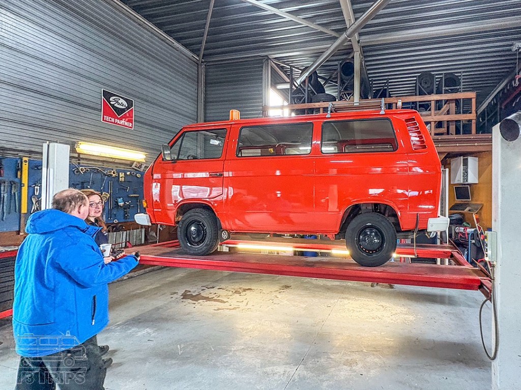 De dag verliep – analoog aan het karakter van de vereniging – informeel en wat rommelig, zodat mij niet duidelijk was dat je – ook al had je je per email aangemeld – expliciet moest vragen of er door een Team Techniek-lid naar (een bepaald vraagstuk aangaande) je bus kon worden gekeken, en of je bus op de brug kon. Toen dat aan het einde van de dag dan toch gebeurde, stortten zoveel leden van het technische team zich op (of eigenlijk onder) mijn bus, dat ik er zelf nauwelijks meer bij kon en maar half meekreeg wat ze constateerden. Gelukkig waren er niet veel aandachtspunten, die mij grotendeels zelf ook al bekend waren. Wel had ik graag wat meer vragen kunnen stellen, maar de tijd daarvoor ontbrak. Maar hopelijk kan ik die per email alsnog adresseren. Ook van het meekijken bij de inspectie van andere bussen stak ik het nodige op, zodat het al met al toch een nuttige dag was.